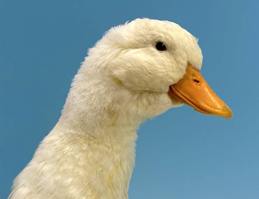 This yellow colour is seen in other white breeds, where it is seen as a negative feature, but in the Pekin it is required. The colour is enhanced by inclusion of maize in the feed and by restricted exposure to the bleaching effects of strong sunlight. The eyes are blue, and the bill, legs and feet bright orange. The plumage is particularly dense and rather fluffy, giving the birds a chubby facial appearance.