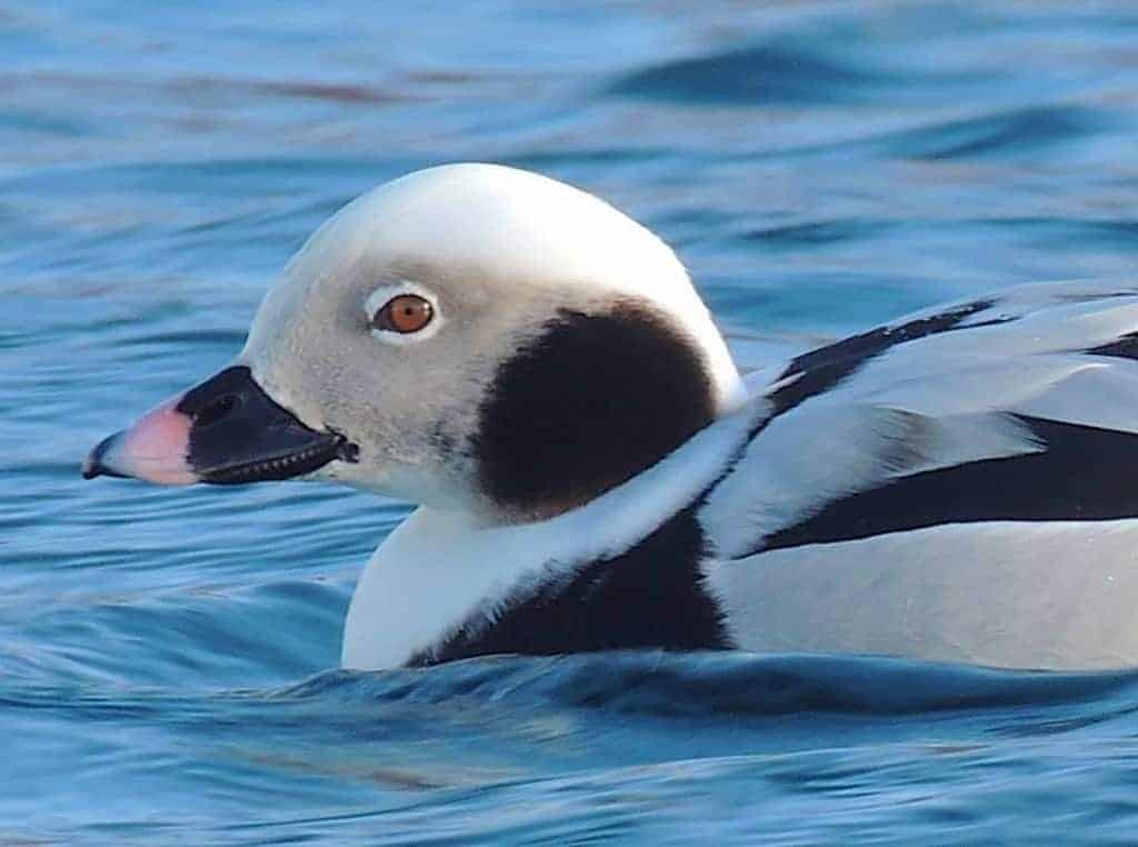 One of the most charismatic of our sea ducks, the Long-tailed Duck's call is captivating. Melodious yodelling and yelps hardly do it justice. Long-tails are slightly unusual in their plumage, having three distinct suits each year (most ducks moult twice per year). In a complex series of overlapping partial moults, changes in plumage happen continuously from April to Ocober. The breeding plumage is only at its best in the winter.
