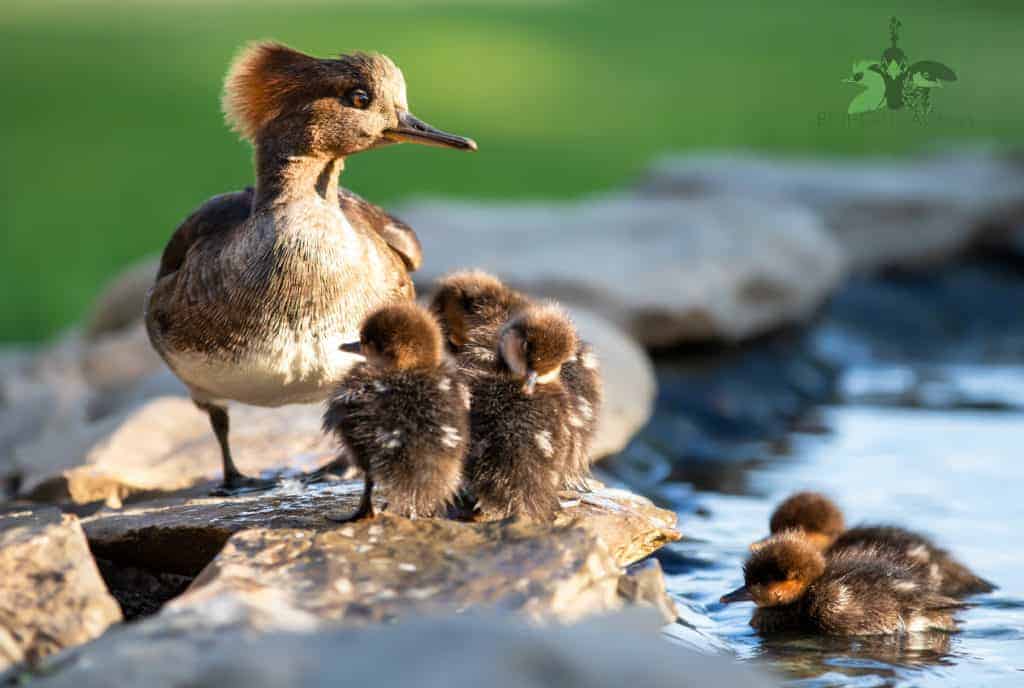 Hooded Mergansers will take to nest boxes or barrels, either on the ground or raised. Sometimes they will nest some distance from the water, but generally they really like boxes over the water. The ideal size for the entrance hole is 8cm. 8–12 white eggs are incubated for 32 to 33 days by the female alone. The drake deserts once incubation starts.
